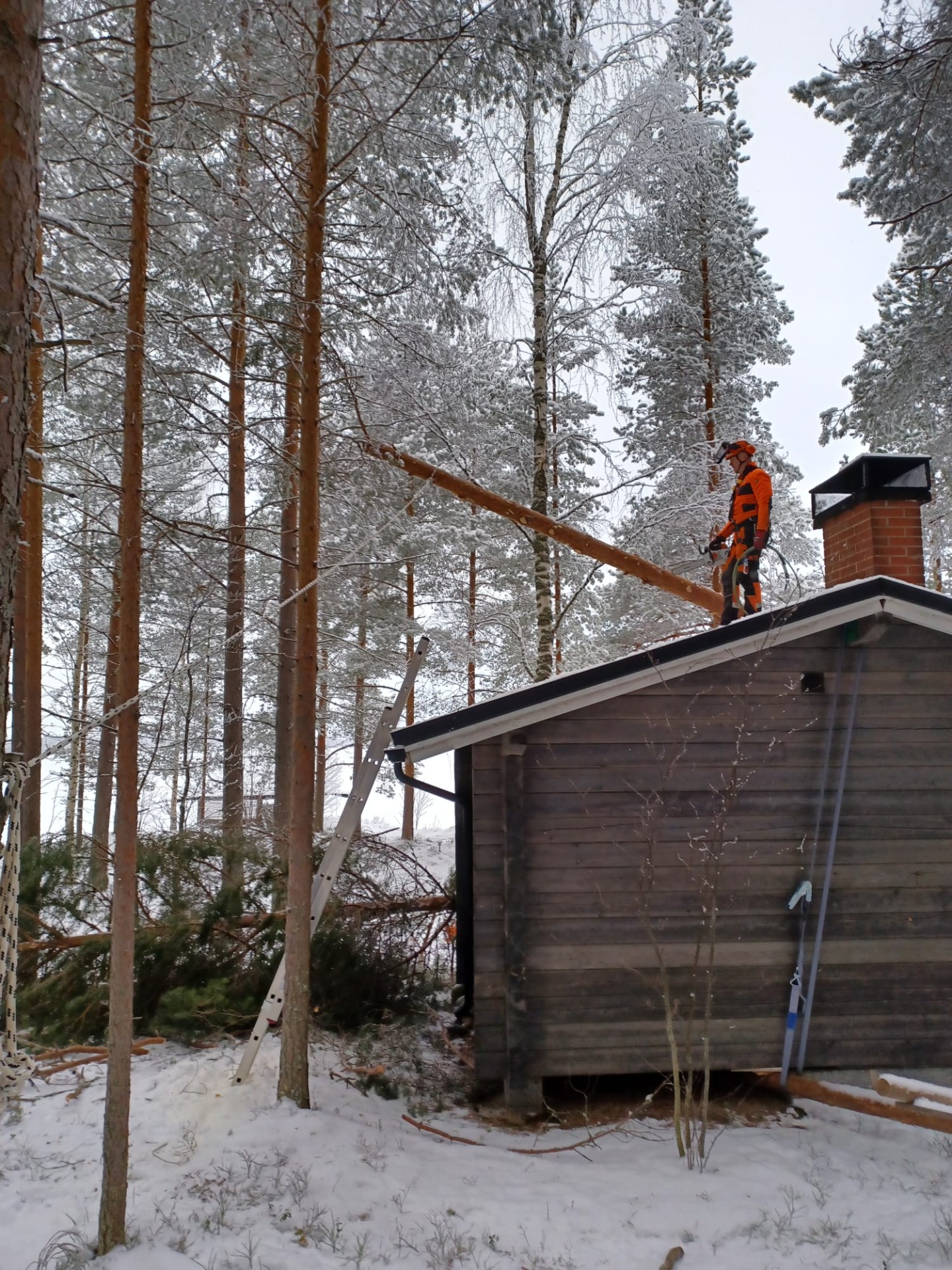 Palveluihin kuuluu myös haastavat myrskyjen kaatamat puut. Näihin pyrin reagoimaan mahdollisimman nopeasti, jotta saat vakuutusyhtiön yleensä vaatiman kustannusarvion pian ja työ päästään aloittamaan lisävaurioiden välttämiseksi.